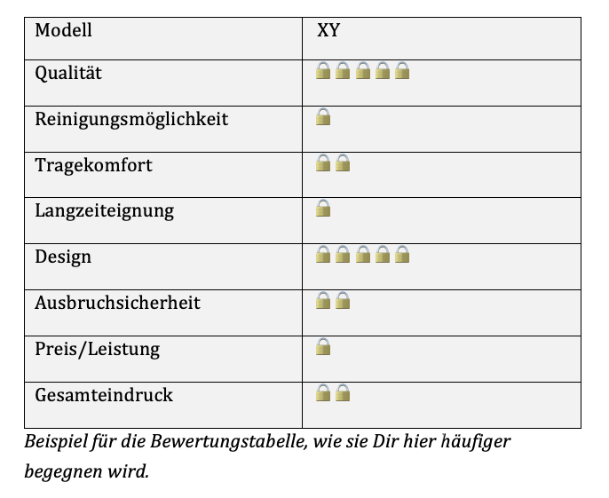 Eine übersichtliche Tabelle ermöglicht es Dir, jeden Keuschheitskäfig mit einem Blick schnell und bequem einschätzen zu können. Dabei hat das Team verschiedene Aspekte bewertet: